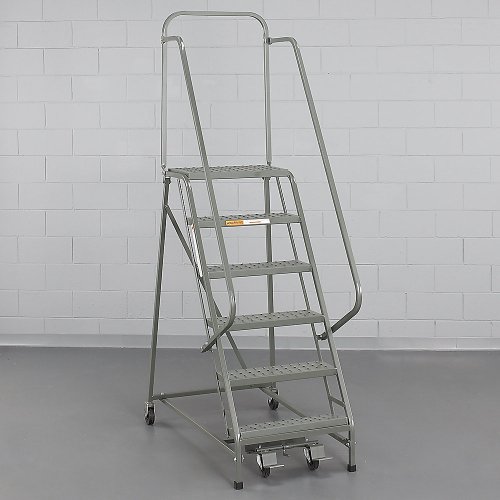 EGA 60° Standard Slope Ladders with 5 to 12 Steps - Gray . 5- to 12-Step ladders are shipped in protective crating. EGA 60° Standard Slope Ladders with 5 to 12 Steps roll easily, yet lock securely in place. Rugged construction: 1" square tubular steel handrails and frame are 40% stronger than round tubing. 5 "7-step ladders feature heavy-duty EZY LOCK first step, allowing easy operation—no bending, foot release—low maintenance. Four casters supplied on all ladders. Perforated stair tread gives assurance of a solid step with the convenience of 1"Lx3/8"W perforations for slip resistance and prevention of dirt build-up. Grip-Strut treads offer extra slip resistance in wet working environments. 7" deep steps, 9" top platform. Legs of ladders are equipped with rubber tips for extra safety. Welded sub-assemblies for extra strength. Hand rail is 30" above platform for extra protection. All ladders meet OSHA standard 1910.29 and ANSI standard A14.7-1991. Oversize top platforms available in depths of 21", 28", and 35". All-welded versions of ladders available upon request. NOTE: number of steps listed in chart includes top platform. Most ladders ship via small package carrier.
