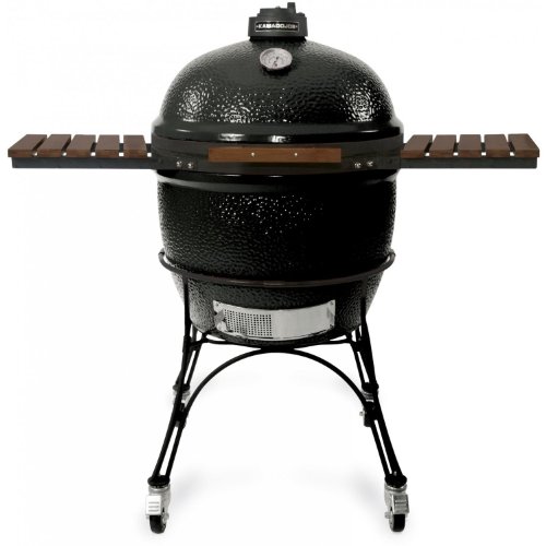 Kamado Joe Bigjoe Ceramic Kamado Grill On Cart - Black?Kamado Joe BigJoe Ceramic Kamado Grill On Cart - Black. BJ24B. Cart Mounted Charcoal Grills. Kamado Joe presents the perfect tool for any backyard grilling job, with the BigJoe ceramic Kamado grill on cart. The BigJoe Kamado is a grill, smoker and oven all in one, and since it takes very little time to heat up, you can be ready to cook in 15 minutes. The unique design allows you to experience incredibly tender food with a true charcoal infused flavor. This Kamado grill is constructed from 1 1/4-inch thick ceramics, allowing it to hold heat and maintain temperature control, burning less fuel and saving you money. The thick, porous ceramic keeps moisture in your food, producing better results than traditional Kamado grills. Enjoy the luxury of cooking on a commercial-grade 304 stainless steel cooking grate with 452 square inches of grilling area. A split fire box creates separate temperature zones and raises fuel efficiency. The fire grate is made of powder coated cast iron for durability and superior heating performance. The convenient ash screen stops charcoal ashes from spilling while you grill, and the removable ash pan makes it easy to dispose of ashes during cleanup. The corrosion resistant 304 stainless steel draft door allows you to adjust the flow of heat for consistent results that fit your grilling style. The built-in thermometer allows you to monitor cooking temperatures, even when the grill lid is shut. The lid hinge is made of powder-coated galvanized iron for quality that lasts, and the counterbalanced design reduces the effort of lifting the heavy-duty ceramic lid. The powder-coated cast iron grill cart has locking casters to prevent the grill from moving once you get cooking. The teak finished bamboo handle provides a cool, comfortable grip, and the matching side shelves provide a strong storage surface for grilling essentials. All Kamado Joe ceramic Kamado grills are crafted with a heat-resistant ceramic coating, a personal recipe created by Kamado J