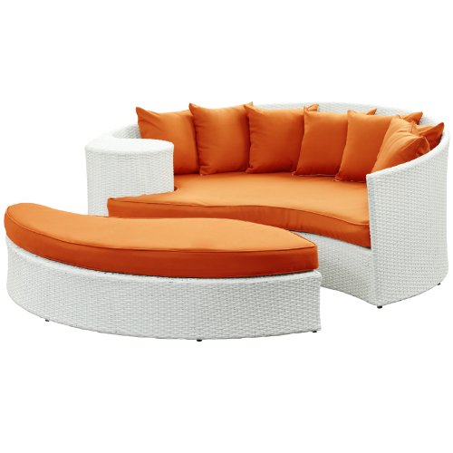 LexMod Taiji Outdoor Wicker Patio Daybed with Ottoman in White with Orange Cushions?Harmonize inverse elements with this radically pleasing daybed set. Seven plush throw pillows adorn Taji's thick all weather orange cushions allowing for the splendorous blending of mediating elements. Find the key to attainment as you bask in a charged and unified landscape of expansiveness. Daybed Dimensions: 71"L x 51"W x 29"H Ottoman Dimensions: 59"L x 28"W x 10"H Seat Height: 10"H Back Height: 29"H