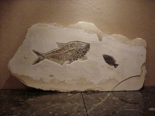 About 50 million years ago, these fish swam in a fresh water lake located in Southwestern Wyoming. When the fish died, they sank to the bottom of the lake where they were quickly buried. The soft sediment encased the fish and as the rock hardened over time, the skeleton was preserved.