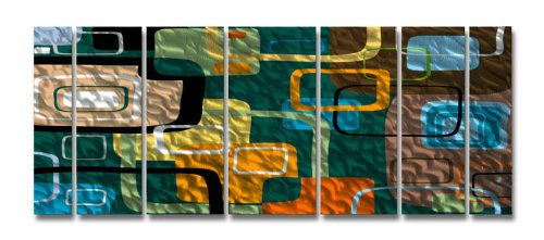 138x48 Modern painting on metal wall decor by artist Ash Carl, modern home decor, metal wall sculpture, contemporary wall art?This artwork is composed of 7 different panels! It features an amazing array of colors and handsanded detail!Thank you for taking the time to view our artwork! Our work is collected in every U.S. state and worldwide in over 35 different countries! These pieces cannot be justified by pictures. The reflections that are hand carved into each piece can only show there best qualities in person! This metal wall decor was created in our studio for my 2010 limited edition. It features an array of great detail. These pieces cannot be justified by pictures. The reflections that are hand ground and sanded into the metal of each piece can only show there best qualities in person. This piece seems to "move" as you walk past it. The artwork has a three dimensional appearance that will attract anyone who sees it. This museum quality metal wall art will leave your guests speechless!! Hand Made, This is a great focal point that compliments any modern, abstract or contemporary decor. It is sure to grab attention and impress all admirers!!! These pieces will "come to life" if you can place some direct light on them. This artwork comes with the mounting brackets pre-attached!