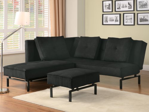 #This versatile Chaise Sofa Bed by Coaster allows multiple configurations. This is a great solution for the apartment or dorm room when space is a premium. This sofa bed can be quickly converted to a bed by folding down the ratchet back and sliding the two pieces together. This sofa bed features plush seating and it is wrapped in a durable black fabric. It comes with a matching ottoman and accent pillows.