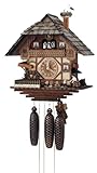 Are you looking for the best review for River City Clocks Eight Day Musical Cuckoo Clock with Blacksmith Swinging Hammer and Moving Waterwheel? Read customer review, features, specifications, description, check prices update and more satisfying for River City Clocks Eight Day Musical Cuckoo Clock with Blacksmith Swinging Hammer and Moving Waterwheel product reviews! This eight day Black forest musical cuckoo clock features a blacksmith hammering in front of a cottage. The top of the chimney has a seagull nest holding two chicks and their mother At the top of every hour the man swings his hammer up and down, the waterwheel turns, the dancers revolve, and the clock plays one of two different twenty-eight note melodies, Edelweiss and the Happy Wanderer. Three cast iron pine cone weights are suspended beneath the clock case by three separate brass chains. The hand-made pendulum continously swings back and forth which controls the timing of the clock. On every hour the cuckoo bird emerges from a swinging door above the clock dial and counts the hour by cuckooing once per hour. (Example: At one o'clock the bird will cuckoo once. At eight o'clock the bird will cuckoo eight times) The half hour is announced with one cuckoo call. There is a sound shut-off device beneath the base of the cuckoo clock. Pushing the lever up disables the cuckoo birds cuckoo, the blacksmith, waterwheel, and the music. Pulling the lever down enables the blacksmith, the waterwheel to move and allows the music and cuckoo. The eight day Regula movement is wound once per eight days by raising the three pine cone weights. One weight powers the time, one weight powers the Swiss music box, and the other weight powers the cuckoo bird and cuckoo call, the band, and waterwheel. Great effort has been made to portray each cuckoo clock as accurately as possible. As with many handmade items, the exact coloration and carving may vary slightly from clock to clock. We consider this to be a special part of their character.